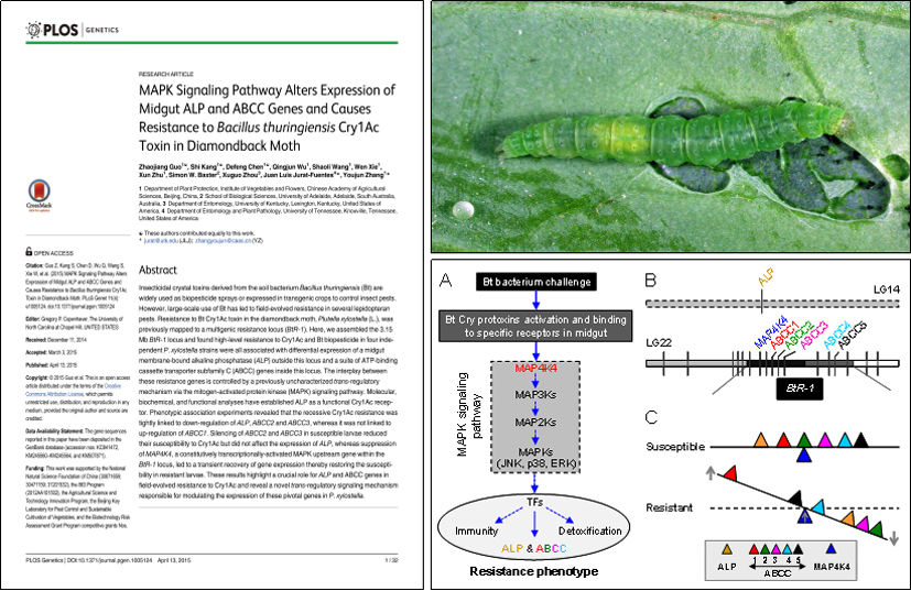 (3)Guo, Z., Kang, S., Chen, D., et al. MAPK signaling pathway alters expression of midgut ALP and ABCC genes and causes resistance to Bacillus thuringiensis Cry1Ac toxin in diamondback moth. PLoS Genetics, 2015, 11(4): e1005124.