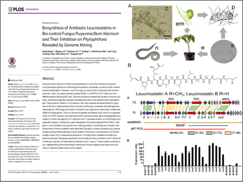 (8)Wang, G., Liu, Z., Lin, R., et al. Biosynthesis of antibiotic leucinostatins in bio-control fungus Purpureocillium lilacinum and their inhibition on Phytophthora revealed by genome mining. PLoS Pathogens, 2016, 12(7): e1005685.
