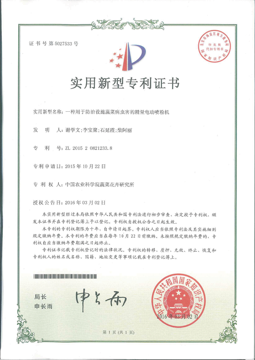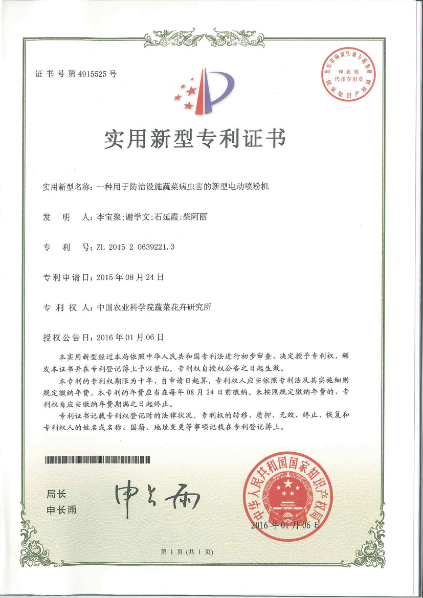 (27)一种用于防治设施蔬菜病虫害的精量电动喷粉机,ZL201520821233.8