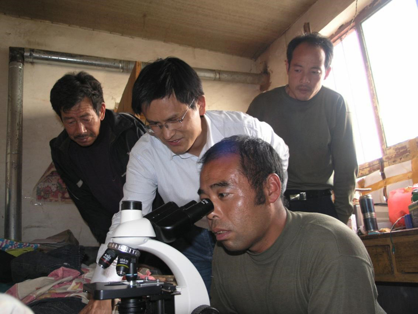 李宝聚(左二)指导农户利用显微镜进行病原物观察