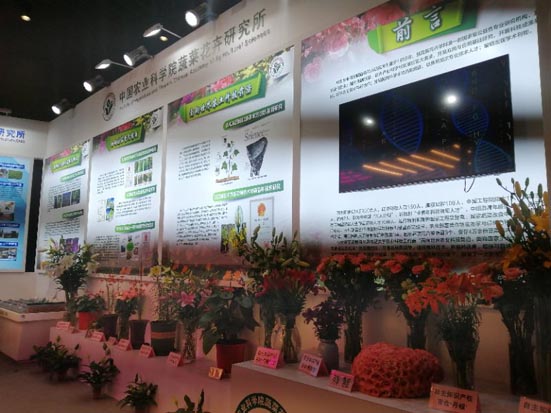 我所展板主要由4部分构成,第一部分:前言,主要介绍全所概况;第二部分:面向世界农业科技前沿,主要介绍了甘蓝雄性不育系育种技术体系的建立与新品种选育、黄瓜基因组和重要农艺性状基因研究,分别获2014年国家科技进步二等奖和2018年国家自然科学奖二等奖;第三部分:面向国家重大需求,主要介绍了黄瓜优质多抗种质资源创制与新品种选育、重大外来入侵害虫—烟粉虱的研究与综合防治,分别获2018、2008年国家科技进步二等奖;第四部分:面向现代农业建设主战场,主要介绍了非耕地园艺作物生态高效生产技术研究与示范及花卉(月季、百合、牡丹等)新品种选育、组织培养、种苗(种球)生产及高效栽培技术研究等。