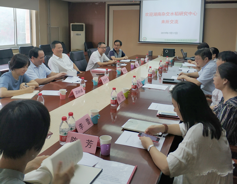 7月17日,湖南杂交水稻研究中心主任齐绍武一行来所调研。蔬菜花卉所所长张友军,党委书记周霞,成果转化处处长李瑞云,财务处处长徐力,办公室(人事处)主任(处长)李海芬、副主任(副处长)陈芳,科研处副处长李蕾等参加座谈。