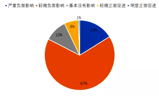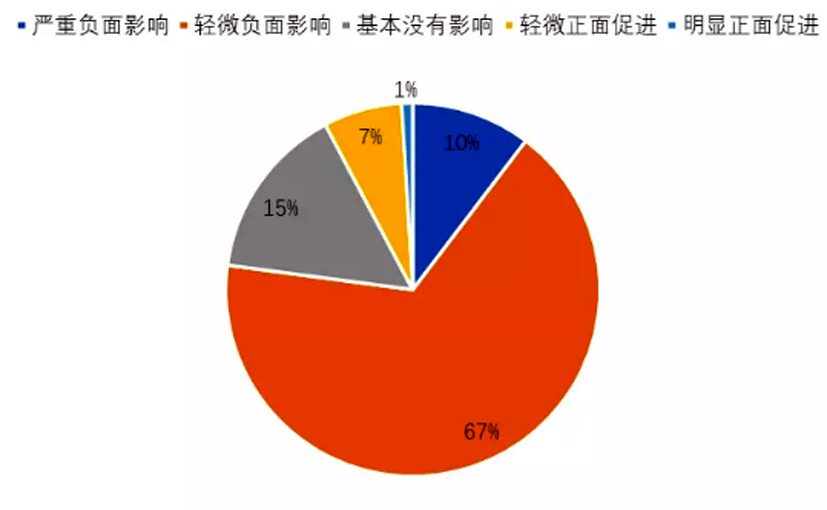 在疫情对所处领域产生的影响上,67%的人选择轻微负面作用,15%的人选择基本没有影响,10%的人选择严重负面影响,7%的人选择轻微正面作用,仅 1%的人选择明显正面作用。
