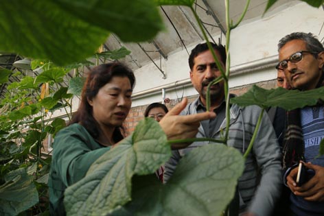 顾兴芳研究员在温室给学员讲授黄瓜选育技术