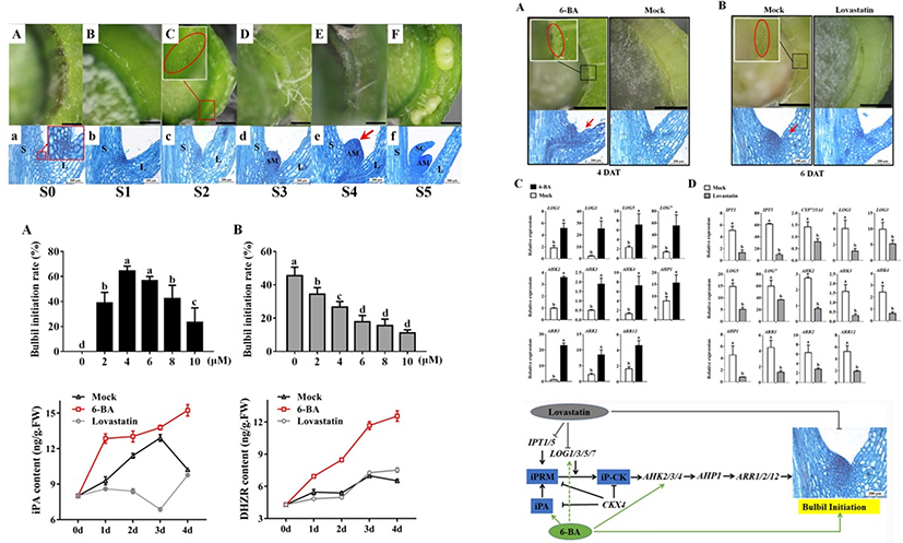 该研究通过外源细胞分裂素和抑制剂进行处理,通过解剖学、组织学分析、激素测定及基因表达分析,阐明了细胞分裂素调控卷丹珠芽形成的机理。研究表明,珠芽起源于叶腋分生组织,细胞分裂素在珠芽发育过程中发挥重要作用。激素测定结果表明,iPA型细胞分裂素在珠芽启动阶段发挥关键作用。通过对细胞分裂素通路基因表达分析发现,在珠芽启动阶段合成(IPTs)及活化基因(LOGs)表达量显著升高而降解基因(CKX)表达量显著降低,从而使叶腋处iPA型细胞分裂素含量积累。此外,我们还发现,外源施加细胞分裂素不仅能够促进iPA和DHZR型细胞分裂素的合成还能通过促进活化基因LOGs和信号传导途径基因表达进而促进珠芽的形成;而外源施加细胞分裂素抑制剂能够抑制合成基因IPTs和活化基因LOGs的表达,从而导致叶腋处iPA型细胞分裂素合成降低,进而抑制珠芽的形成。