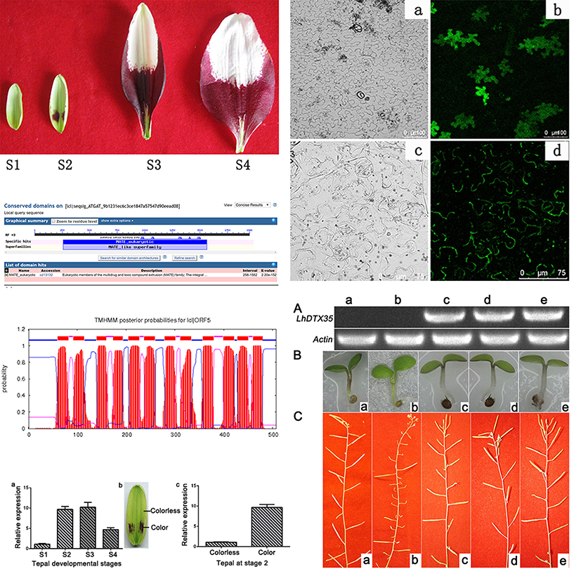 该研究运用RACE技术、生物信息学分析,亚细胞定位,互补实验等实验方法研究了MATE转运蛋白在百合花花青素苷转运中的作用。研究表明,百合花中LhDTX35基因编码的蛋白属于MATE基因家族中的一种重要转运膜蛋白。表达谱分析表明,LhDTX35基因与不同发育期的百合花花青素苷的表达量呈正相关,且该基因在S2时期花瓣下部有色部位高表达,而在上部花瓣无色部位低表达。拟南芥突变体互补实验表明LhDTX35基因能恢复拟南芥DTX35突变体果荚不育性和下胚轴花青素含量低的表型,实验结果表明,百合花中LhDTX35基因编码的MATE类似蛋白参与了百合花花青素苷的转运。