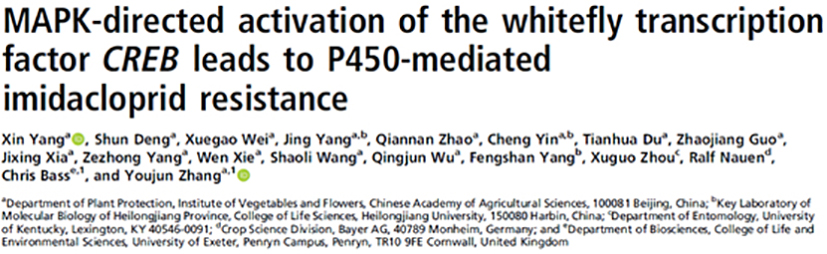 近日,本所张友军研究员团队发现MAPK信号通路通过转录因子CREB调控了细胞色素P450基因CYP6CM1过量表达,介导了烟粉虱对烟碱类杀虫剂的抗药性。该研究揭示了害虫抗药性进化与调控的新机制,为发展新的害虫抗性治理技术、制定有效的抗性治理策略奠定了理论基础。相关内容“MAPK-directed activation of the whitefly transcription factor CREB leads to P450-mediated imidacloprid resistance”在线发表在Proceedings of the National Academy of Sciences of the United States of America(PNAS)上。