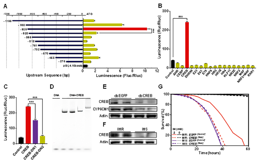 害虫抗药性是导致害虫防治失败、农作物产量损失以及农药残留的重要原因,P450过量表达是害虫对大多数杀虫剂产生抗性的主要机制,但对于昆虫如何调控这些P450基因表达以形成抗药性却知之甚少。前期研究表明昆虫P450基因CYP6CM1过量表达是导致世界性重大农业害虫烟粉虱(Bemisia tabaci)形成新烟碱类杀虫剂抗性的重要原因。本研究通过大量筛选烟粉虱调控P450表达的疑似转录因子,最终发现一个新的转录因子CREB具有增强P450基因CYP6CM1表达的作用。