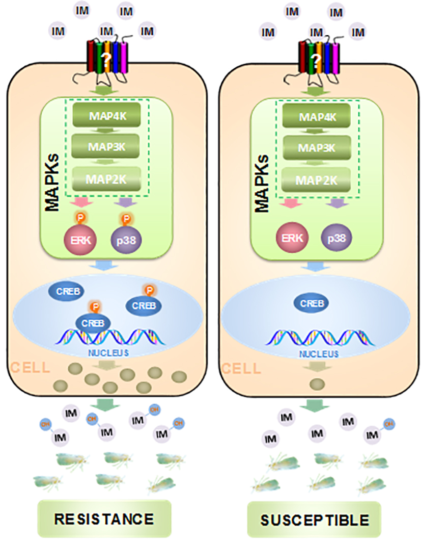进一步的调控机制研究发现,转录因子CREB又受到丝氨酸激酶信号通路MAPK的调控,该通路的ERK和p38信号通过磷酸化CREB蛋白的111位丝氨酸使其活化,进而激活了下游的靶基因—P450基因CYP6CM1并导致其过表达,该解毒蛋白的过量表达增加了对杀虫剂的代谢能力,并最终导致了烟粉虱对烟碱类杀虫剂的抗药性。
