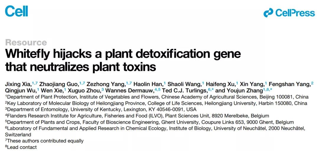 2021年3月25日,禁漫 张友军团队在Cell杂志在线发表了题为Whitefly hijacks a plant detoxification gene that neutralizes plant toxins的研究论文。该团队经过20年的不懈努力,发现了世界重大入侵害虫烟粉虱中存在植物源的水平转移基因BtPMaT1,并揭示了其解毒植物毒素从而导致烟粉虱广泛寄主适应性的分子机制,这将为新一代靶标基因导向的烟粉虱田间精准绿色防控技术的研发提供全新思路。