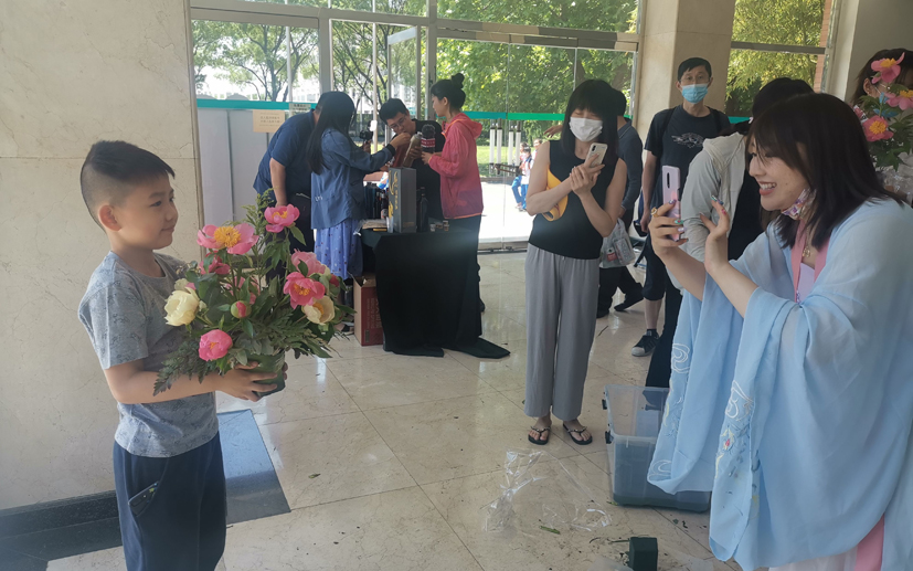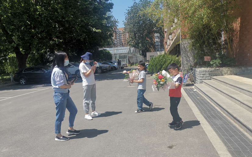 展示插花的老师为小朋友留影。新京报记者 王巍 摄