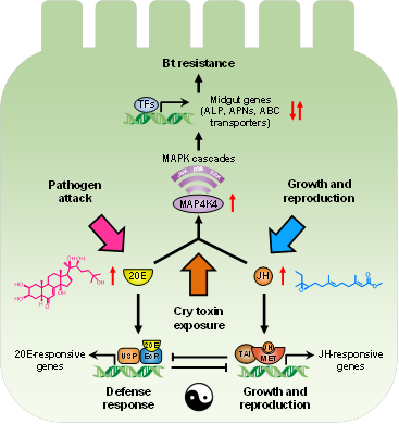 过去10余年间,张友军团队先后建立了Bt敏感和多个Bt抗性的小菜蛾种群,包括对Bt杀虫蛋白Cry1Ac 抗性5000倍的近等基因系种群。研究中,张友军团队证实MAPK信号途径的确是反式调控小菜蛾不同中肠受体基因差异表达的“通用开关”,并发现在Bt杀虫蛋白Cry1Ac高抗小菜蛾中,蜕皮激素(20E)和保幼激素(JH)含量均显著升高且它们之间的串扰可以激活MAPK信号途径反式调控机制,使小菜蛾在维持正常生长发育的前提下对Bt 杀虫蛋白完美进化产生高抗性。
