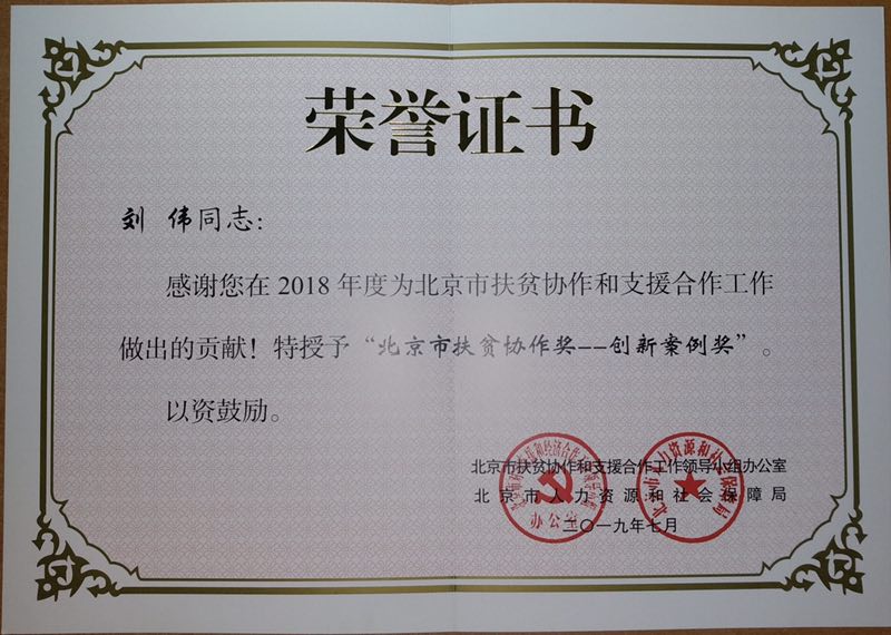 为充分肯定北京市扶贫协作工作取得的丰硕成果,展现广大扶贫工作者无私奉献、顽强拼搏、团结协作的良好精神风貌,进一步凝聚合力、激发动力,北京市扶贫协作和支援合作工作领导小组办公室、北京市人力资源和社会保障局决定,对2018年度表现突出的个人和集体授予“北京市扶贫协作奖”,其中北京市扶贫协作奖-创新案例奖20名,禁漫 刘伟研究员名列其中。