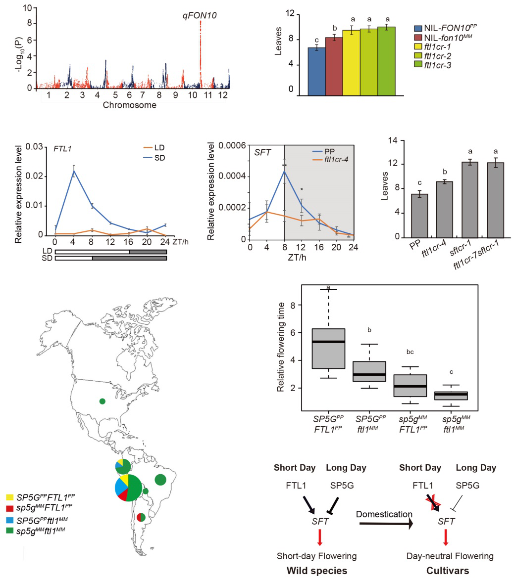 研究者利用短日照敏感的野生醋栗番茄和日中性的栽培番茄构建的重组自交系群体,通过关联分析获得了一个调控番茄短日照开花的主效QTL位点qFON10。通过图位克隆发现,该位点是由于番茄中FT同源基因FTL1的突变造成的。栽培番茄中FTL1突变导致其在短日照下开花延迟。与番茄成化素基因SFT不同,FTL1仅在短日照条件下特异表达,并通过和14-3-3/2互作与SPGB形成开花激活复合物调控番茄开花。进一步研究发现,FTL1通过调控SFT表达进而控制番茄短日照开花。具有ftl1MM或sp5gMM基因型的樱桃番茄在番茄起源地附近分布,说明FTL1和SP5G在驯化过程中被独立选择。通过基因编辑同时突变野生醋栗番茄中的FTL1和SP5G,极大地降低了其对光周期的敏感性。