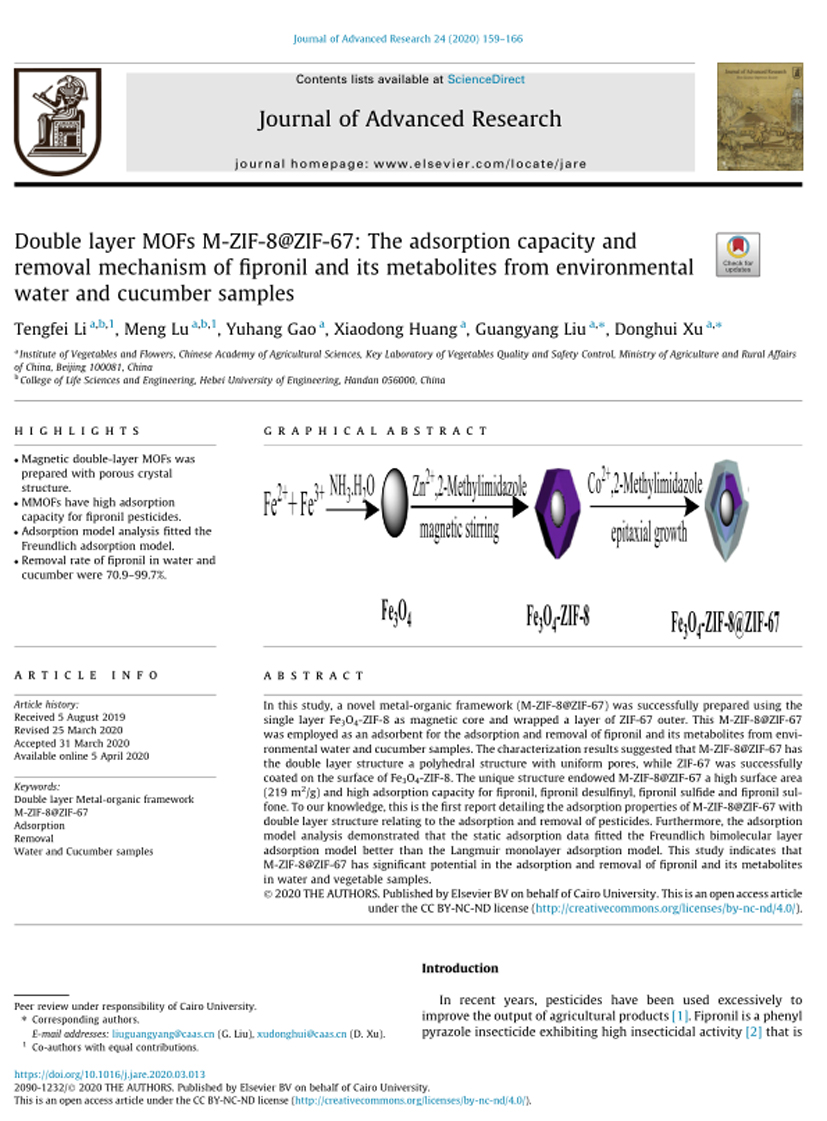 近日,农业农村部蔬菜质量安全控制重点实验室在双层MOFs结构调控和MOFs型SPE柱研发方面取得重要进展,相关成果发表在国际SCI期刊Journal of Advanced Research(10.1016/j.jare.2020.03.013)上,并成功研制了果蔬农药残留MOFs型净化柱产品IVF-MC-1。