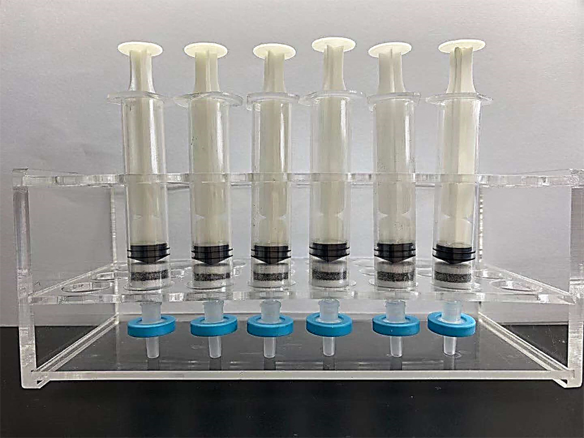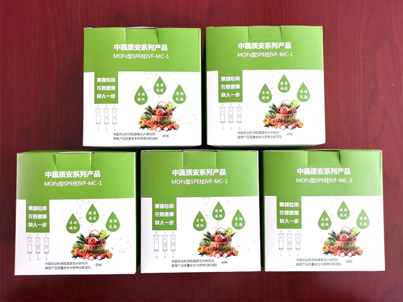结合实验室近四年来在MOFs/农药互作机制方面的研究成果和蔬菜质检中心在农残检测方面积累的十几年研究经验,本实验室借助MOFs材料的界面超疏水/亲水识别特性,成功研发了果蔬农药残留MOFs型净化柱产品。该前处理柱可特异吸附去除果蔬乙腈提取液中的离子、多糖、色素、蛋白等杂质,显著降低基质干扰,大幅度缩短前处理时间、降低实验成本,有效提高农药残留前处理方法的回收率、准确度和重现性。