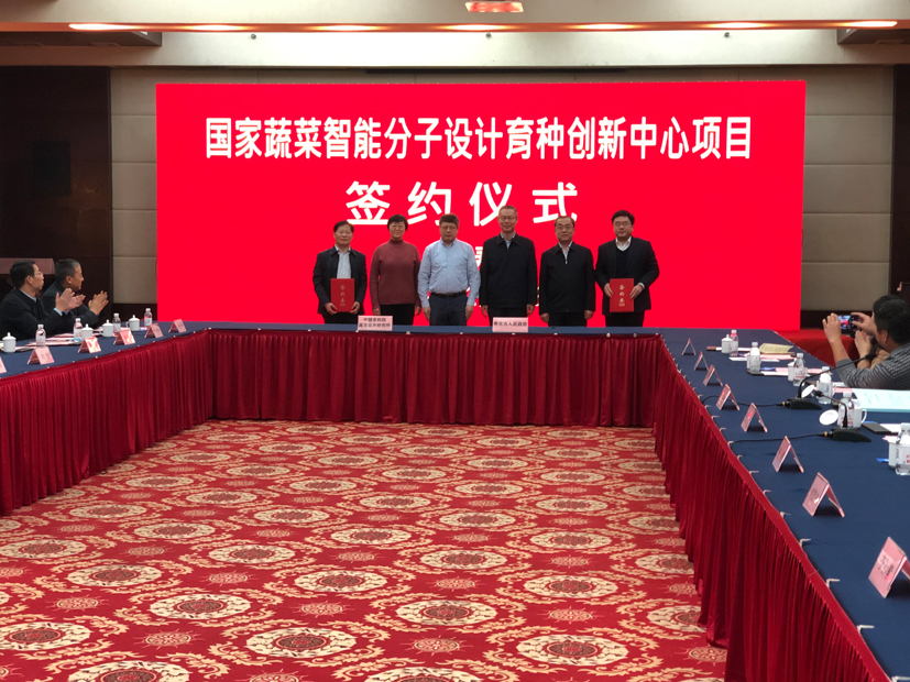 随后,双方举行了“国家蔬菜智能分子设计育种创新中心”项目签约仪式,先由张圣平副所长介绍了项目推进情况,双方围绕项目进行了友好协商。最后,由张圣平副所长与寿光市委常委、统战部部长曹建国代表双方共同签署了“国家蔬菜智能分子设计育种创新中心”合作共建协议。