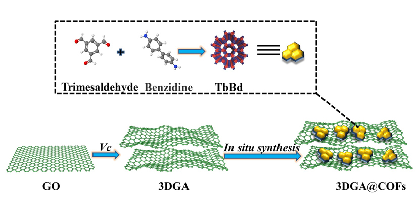 本研究创造性地通过三维石墨烯水凝胶(3DGA)的柔性表面控制COFs反应单体的均匀分布,进而调控反应初期的聚合速度,利用空间引导的自组装生长原理制备了3DGA@COFs复合材料,该材料克服了COFs易自聚成块、活性位点深埋、加工易粉末化和稳定性差等难题。结合固相萃取技术,本研究成功地建立了一种灵敏度高、选择性强、重现性好的有机磷农药检测方法。利用纳米材料表征技术深入研究了3DGA@COFs物理化学性质和潜在的吸附机理,证实了3DGA@COFs可有效去除蔬菜中的马拉硫磷、喹硫磷和三唑磷等有机磷农药,并具有优异的再生性能。上述研究为COFs的功能改性和性能提升提供了新思路,同时为COFs柔性复合材料的制备理论拓展和技术应用延伸奠定了研究基础。
