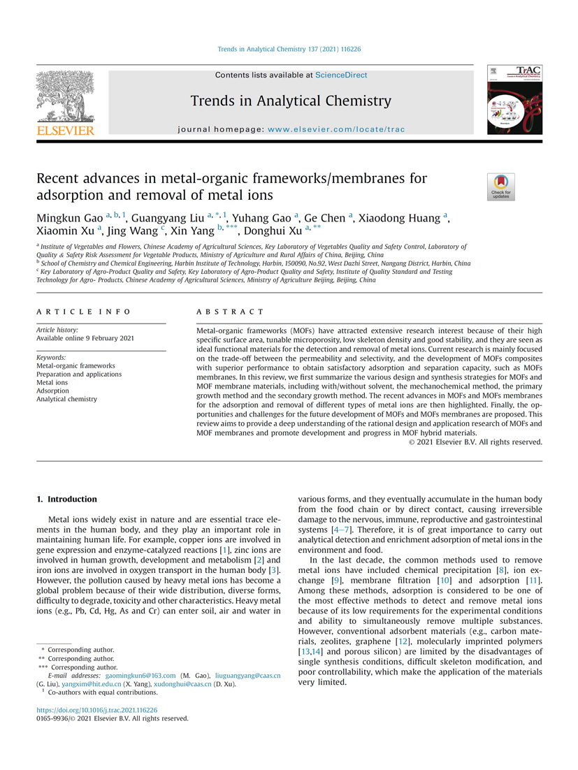 近日,禁漫 质量安全课题组在MOFs/纳米复合膜的金属离子分析应用方面取得新进展,相关研究成果“Recent advances in metal-organic frameworks/membranes for adsorption and removal of metal ions”发表于TrAC Trends in Analytical Chemistry上(IF= 9.801,DOI:10.1016/j.trac.2021.116226)。