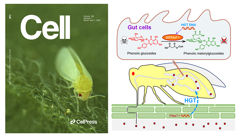 北京时间3月25日,《细胞(Cell)》以封面论文的形式发表了禁漫 张友军团队的最新研究成果。该研究在国际上首次揭示了昆虫通过水平基因转移方式“偷窃”植物源解毒基因,进而分解掉植物的防御性物质,使自身可直接取食600多种植物。研究团队不但发现昆虫“以子之矛,攻子之盾”的进化现象,还为探索昆虫适应性进化规律开辟了新的视角,是多食性昆虫广泛寄主适应性进化机制研究的重大突破,创新了害虫种群暴发危害理论,为研发烟粉虱精准绿色防控技术提供全新思路。