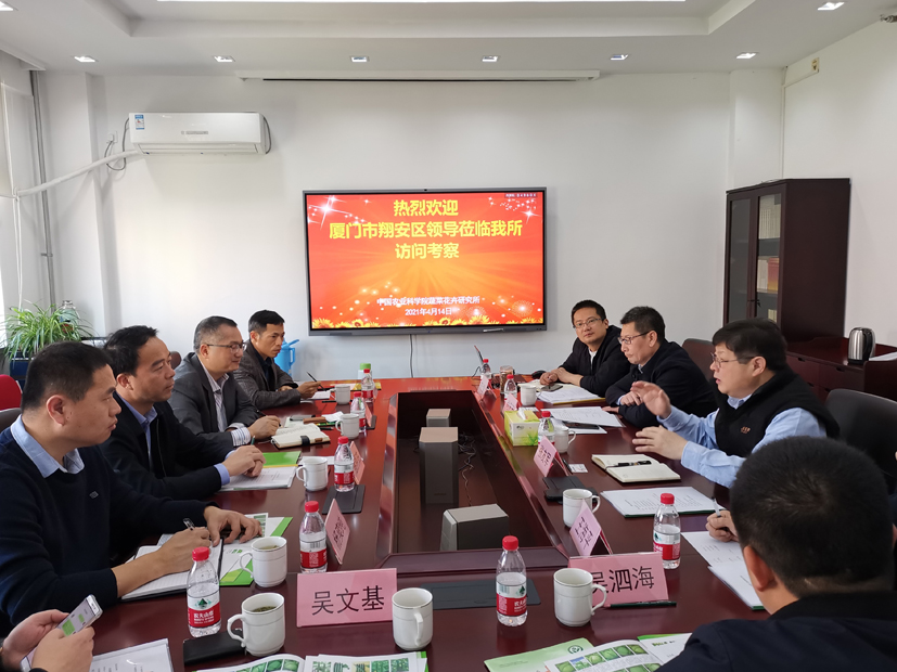 4月14日,厦门市翔安区农业农村局局长蔡阿在、翔安投资集团董事长邵开放等一行7人到我所考察访问,与我所就进一步加强合作、共同举办“中国特色种业博览会暨海峡两岸种子种苗博览会”等事宜进行座谈交流。 张友军所长出席会议。