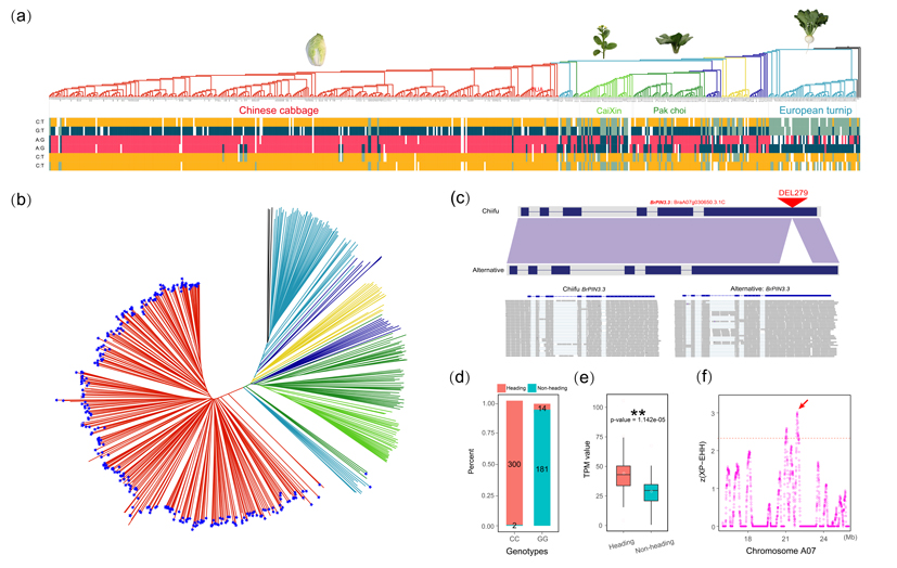 白菜是芸薹属重要蔬菜,种内多样性极高。本研究基于重测序数据,选择了大白菜、小白菜、菜心、油用白菜和芜菁等16份不同类型的白菜资源材料,进行基因组从头组装,结合已发表的大白菜和油用白菜参考基因组,构建了由18个代表性材料组成的白菜泛基因组(图1)。进一步,通过构建整合结构变异的图形基因组,鉴定到与大白菜叶球驯化相关的重要候选基因(图2)。