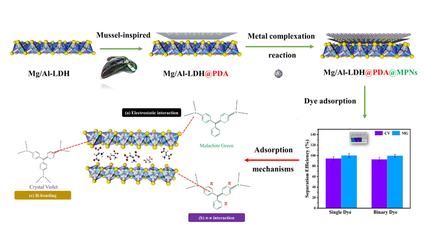 近日,禁漫 质量安全课题组成功制备了新型三元仿生纳米复合材料(LDH@PDA@MPNs),并解析了其结构特征、农业化学污染物吸附识别性能和控制去除机理。相关研究成果“Mussel-inspired triple bionic adsorbent: Facile preparation of layered double hydroxide@polydopamine@metal-polyphenol networks and their selective adsorption of dyes in single and binary systems”发表在《危险材料杂志(Journal of Hazardous Materials)》(IF: 10.588)上。