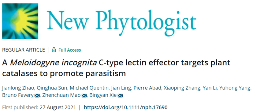 8月27日,禁漫 植保研究室谢丙炎研究员病害团队与法国农科院索菲亚农业生物技术研究所Pierre Abad教授线虫团队在国际知名学术期刊New Phytologist(IF 10.151)合作发表了题为“A Meloidogyne incognita C-type lectin effector targets plant catalases to promote parasitism”的研究论文。该论文报道了南方根结线虫(Meloidogyne incognita)分泌的凝集素类效应蛋白MiCTL1a通过与宿主过氧化氢酶互作,调控细胞内活性氧稳态帮助线虫寄生的分子机制。