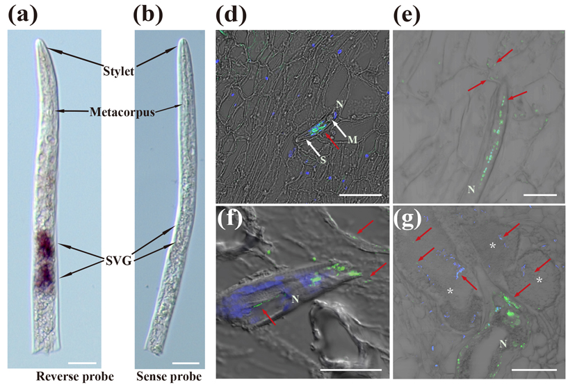 植物寄生线虫是一类专性活体营养型寄生虫,有一句俗语“凡是有植物的地方就有线虫”,表明它们寄主广泛,种类繁多。根结线虫种类超过90种,能够侵染超过5500种植物,每年造成的经济损失超过70亿美元,其中南方根结线虫是农业生产上危害最严重的一类根结线虫。根结线虫的防治主要包括物理防治、生物防治和化学防治,但在田间应用存在见效慢、经济效益低、防治效果差和污染环境等弊端。种植抗病品种是解决问题的关键,但是抗性基因缺乏、商业化应用的抗病基因不耐高温、抗病机理不透彻及毒性群体的出现制约着分子育种技术的开发和应用。因此,解析根结线虫与宿主互作的分子机制,阐明根结线虫的致病机理,能够为寻找防治根结线虫的新靶标并制定新策略提供重要理论依据。近些年研究表明,根结线虫食道腺表达的效应蛋白在线虫与宿主互作过程发挥着重要作用。解析效应蛋白在线虫寄生过程的功能是揭示线虫与植物互作的分子基础。