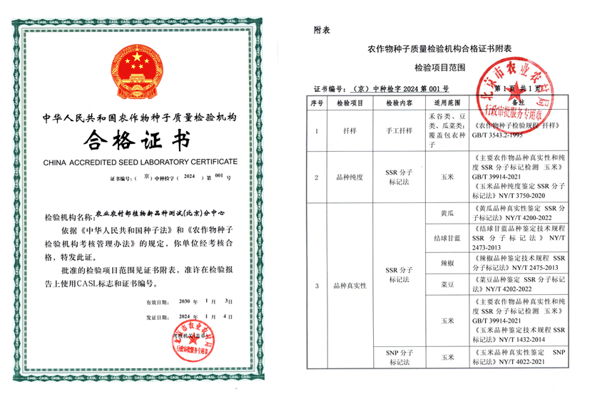 近期,农业农村部植物新品种测试(北京)分中心(植物新品种课题组)通过北京市农业农村局组织的能力验证、文件评审和现场评审,成功获得中华人民共和国农作物种子质量检验机构(CASL)合格证书,具备玉米、辣椒、结球甘蓝、黄瓜和菜豆5种作物的种子真实...