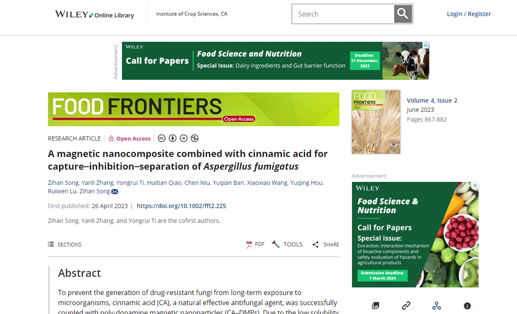 禁漫 采后加工课题组以多巴胺磁性纳米颗粒为核、肉桂酸为壳合成可再生保鲜剂,利用多巴胺捕获富集菌体,使肉桂酸局部浓度增加实现高效杀菌,并能通过磁性回收后再利用。相关研究成果以“Amagnetic nanocomposit...