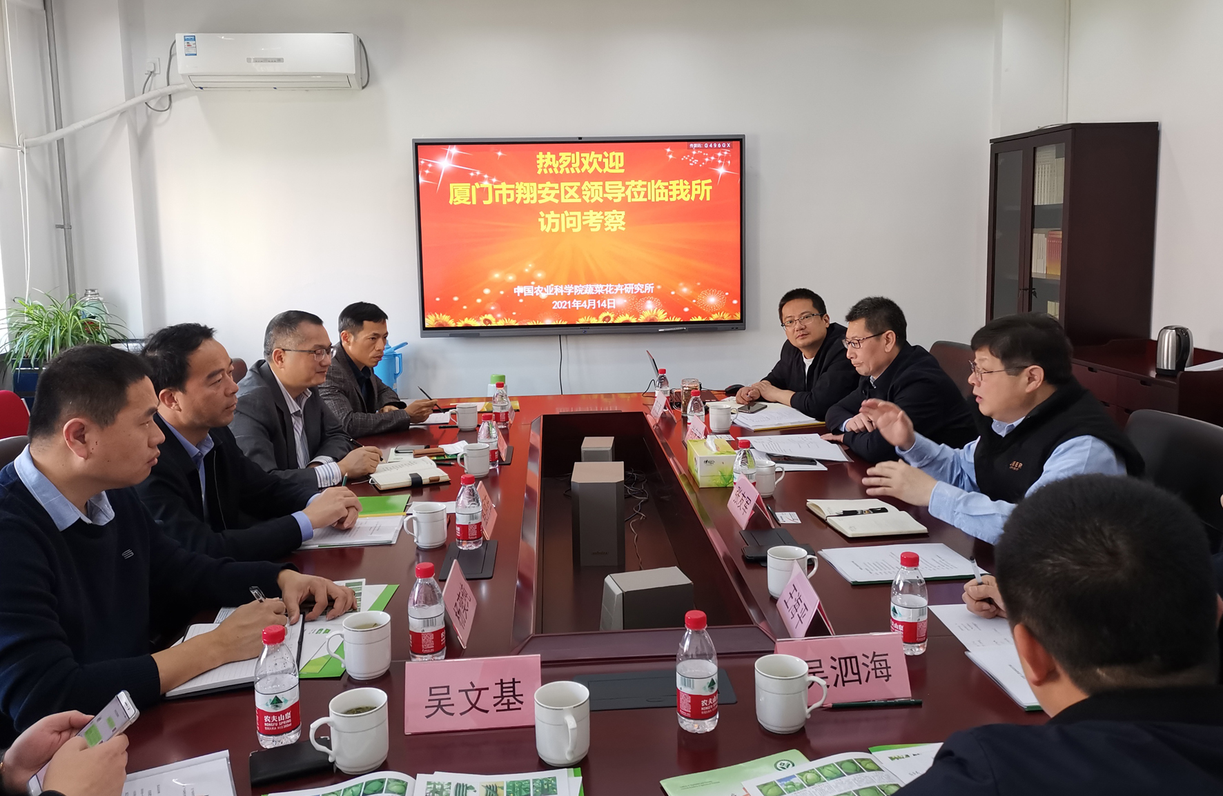 4月14日,厦门市翔安区农业农村局局长蔡阿在、翔安投资集团董事长邵开放等一行7人到我所考察访问,与我所就进一步加强合作、共同举办“中国特色种业博览会暨海峡两岸种子种苗博览会”等事宜进行座谈交流。 张友军所长出席会议。