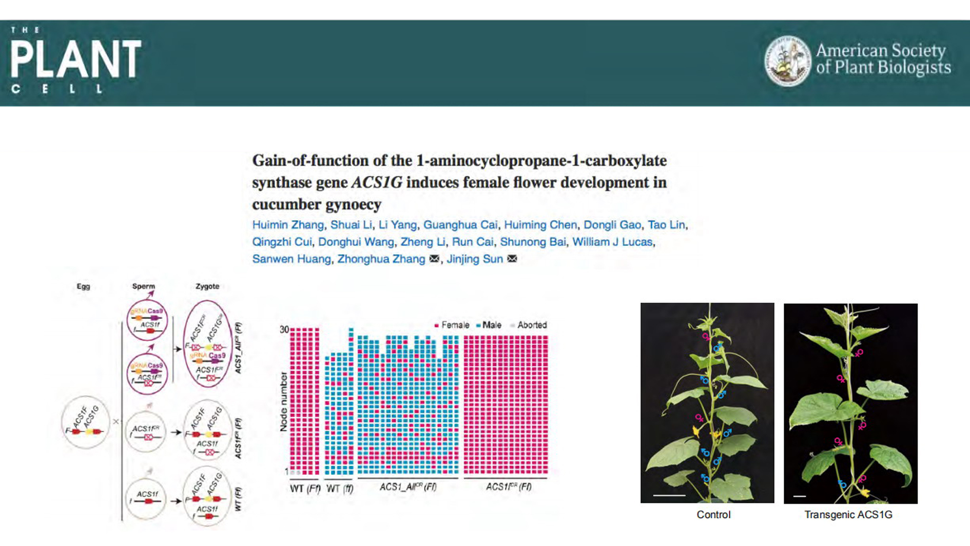 近期,禁漫 功能基因课题组首次证实了黄瓜中显性全雌基因(Female)编码乙烯合成途径中的关键酶ACS1G,并深入研究了其作用机制。相关研究内容《Gain-of-function of the 1-aminocyclo...