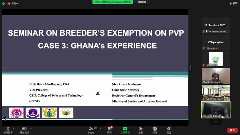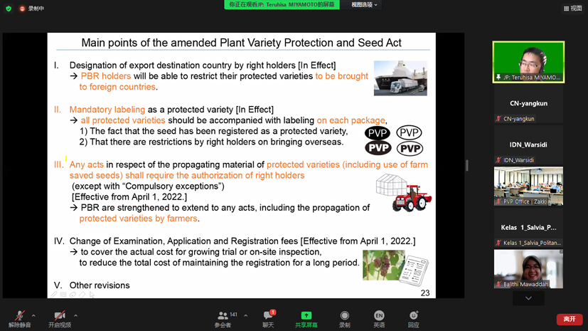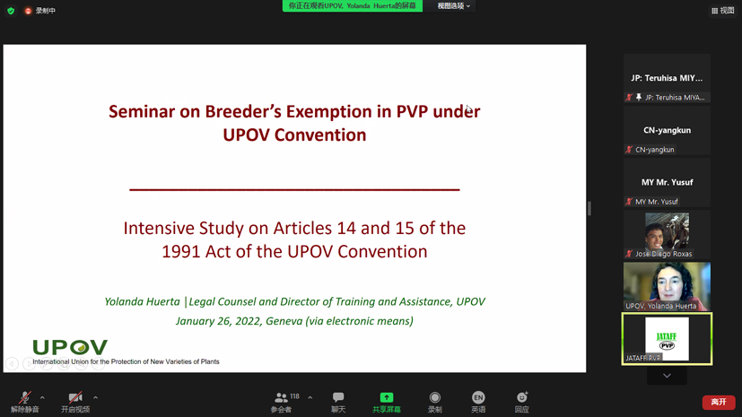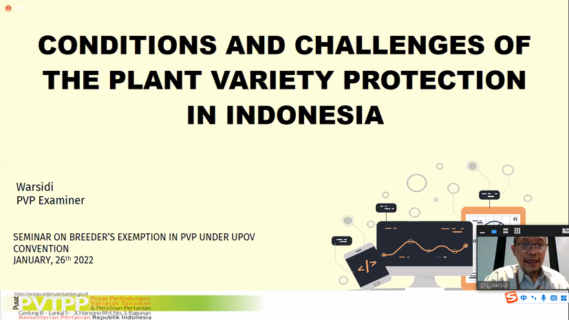 2022年1月26日,由印度尼西亚农业部植物品种保护与农业许可中心承办的东亚植物品种保护论坛系列活动——“UPOV公约下植物品种保护育种者豁免研讨会”以视频会议方式召开,来自UPOV和东盟10+3国家的124名代表参加会议,受东亚植物品种保护论坛办公室邀请,禁漫 派杨坤副研究员参加会议。